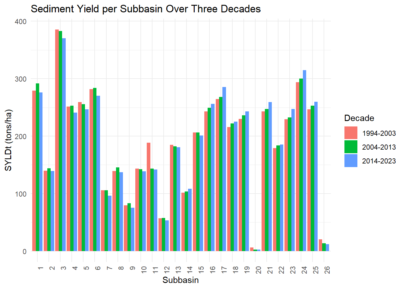- Sediment yield has varied across decades, with fluctuations driven by changes in precipitation, land use, and hydrological dynamics.